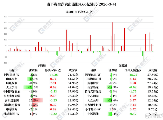 3月4日,南下资金净卖出港股4.66亿港元(yuan)