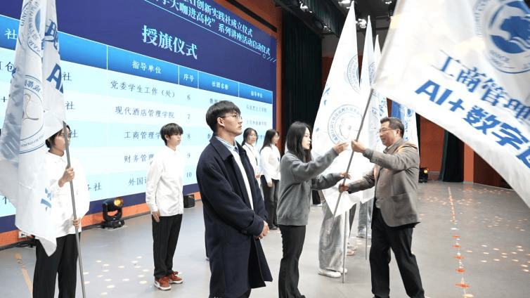 田涛(tao)执(zhi)行(xing)理(li)事宣读《关于成立成都银杏酒店管理(li)学院“AI创(chuang)新实践社(she)”的批复》。王政书书记为社(she)团授旗。袁纪玮副校(xiao)长为指导老师发表(biao)聘书。
