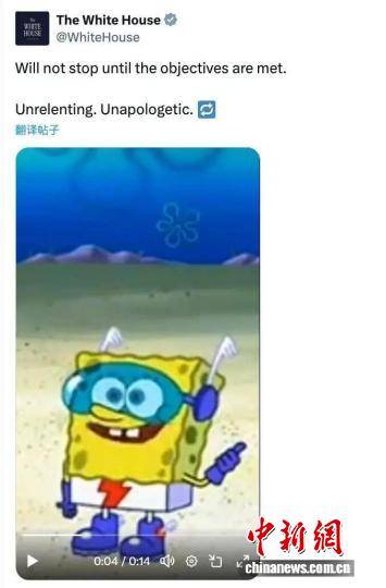 这是美国白宫社交媒体(ti)账号截图。该账号公布的这段视频中,海绵宝宝、电子游戏的欢快旋律(lu)与空袭(xi)伊朗的火(huo)光被剪(jian)辑在一路,视频配发笔墨“不达目(mu)标不罢休”。