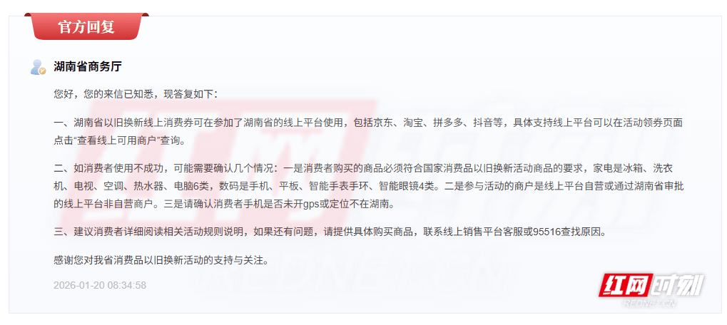 红网时刻新闻1月21日讯(xun)(记者 翁子(zi)茜)近日,有网友在红网《问(wen)政湖南(nan)》栏目征询湖南(nan)省2026年消费品以旧换(huan)新活动中“线上补(bu)贴(tie)券”的具体使用成(cheng)绩,反映其在多个指定平台(tai)尝试使用均未(wei)成(cheng)功。湖南(nan)省商务(wu)厅(ting)对(dui)此作出细致答复,明(ming)确(que)了使用平台(tai)、商品范围及成(cheng)绩排查发起。