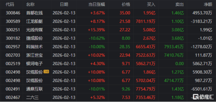 龙虎榜单日净(jing)买入额(e)前三(san)为华(hua)胜天成、光线传媒、大位科技,分别为5.02亿元、3.46亿元、2.87亿元。