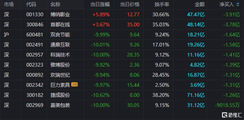 龙虎榜单日净(jing)卖出额(e)前三(san)为博纳影业、首都在线、双良节能,分别为3.91亿元、3.78亿元、1.64亿元。