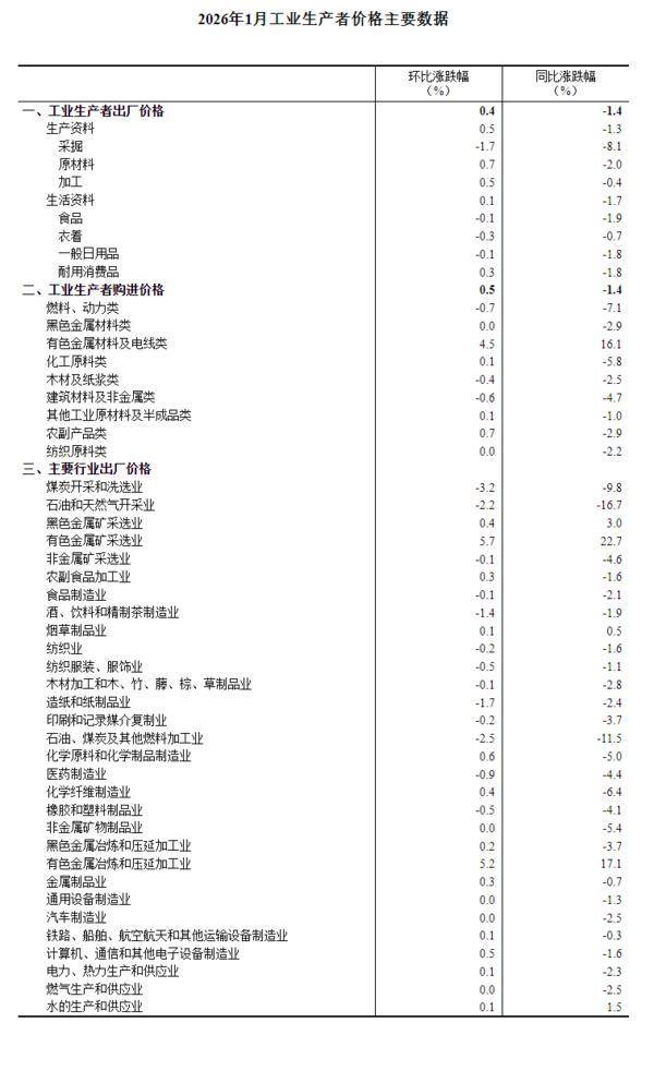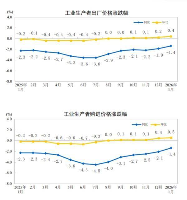 我国网财经2月11日讯 据国度(du)统计局网站音讯,2026年1月份,全国工业生产(chan)者出厂代价同比下落1.4%,降(jiang)幅(fu)比上月收窄0.5个百分点;环比上涨0.4%,涨幅(fu)比上月扩(kuo)大0.2个百分点。工业生产(chan)者购进代价同比下落1.4%,降(jiang)幅(fu)比上月收窄0.7个百分点;环比上涨0.5%,涨幅(fu)比上月扩(kuo)大0.1个百分点。