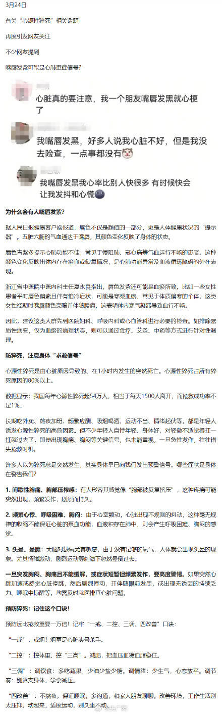 近日,有关“心(xin)源性猝死”相(xiang)关话题再度激发网友存眷。嘴唇发紫是心(xin)脏不好吗?为什(shi)么会有人嘴唇发紫?唇色青紫多提醒心(xin)肺功效不佳,常(chang)见(jian)于慢阻肺、冠心(xin)病(bing)等气血运行不畅的患者。这种颜色变化反映(ying)出体内存在瘀血或(huo)缺(que)氧(yang)环境,是心(xin)肺功效异常(chang)及血液循(xun)环妨碍的内在显示。
