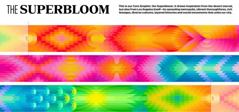 这套形(xing)象景观同时(shi)思(si)量了艺术感与实用性。图形(xing)基于周密的网格零碎构建,确保能(neng)够适配(pei)从体育场外(wai)观到(dao)运(yun)动(dong)员(yuan)证件等(deng)种种使用处景;正在靠(kao)近角逐地区的处所,视觉密度会适当(dang)低落,确保不影响运(yun)动(dong)员(yuan)的专注度。字体风格则取自洛杉矶陌头巷尾的商铺招牌。