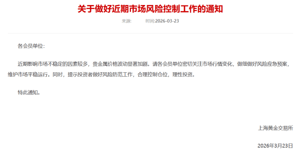 据上海(hai)黄金交易所网站音讯,3月(yue)23日,上海(hai)黄金交易所发布关于做好近期市场风险控制事情的关照: