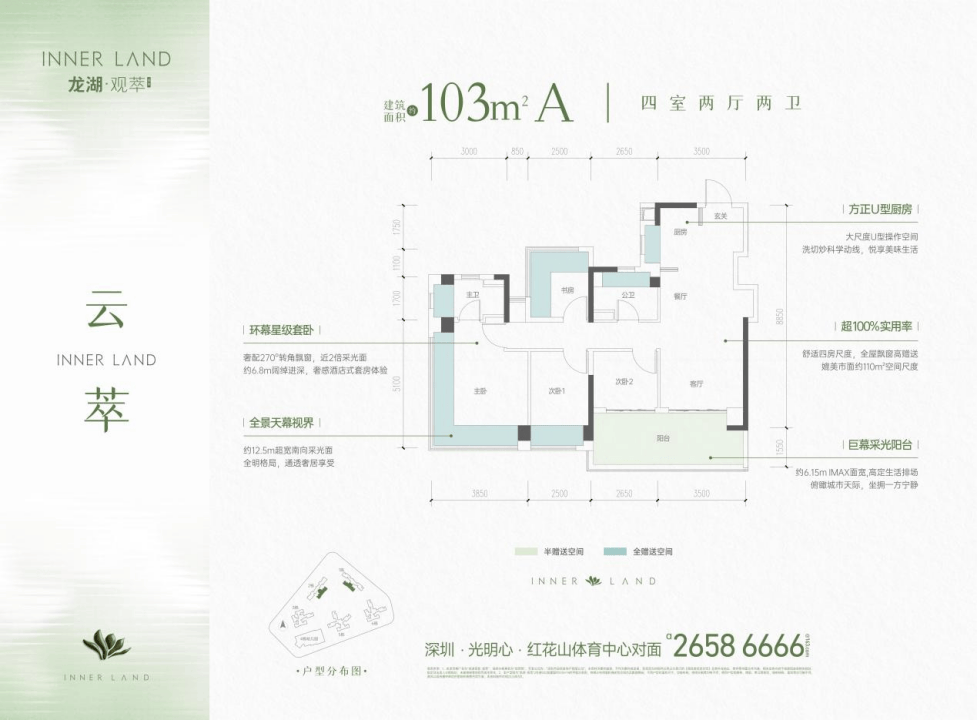建面约103㎡四房是开(kai)放当日最受迎(ying)接,关注(zhu)度最高的明星户型。该(gai)户型面积控制得当,不仅是项目动手门槛最低的户型,也是一款超值户型,有用率(lu)拉满,做出了120㎡+户型的既视感。