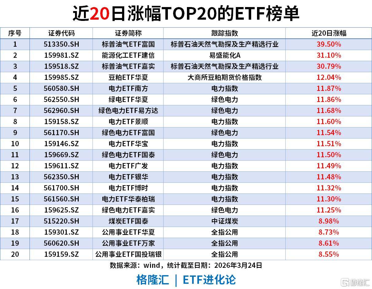 电力、绿色电力相关ETF批量录(lu)得11%左右的涨幅,公用(yong)事业(ye)板块也普遍收获8.5%以上的涨幅,能(neng)源电力链整体景气度极高;豆(dou)粕ETF华夏以12.04%的涨幅跻身榜单第四,农产品(pin)资源同步走强。