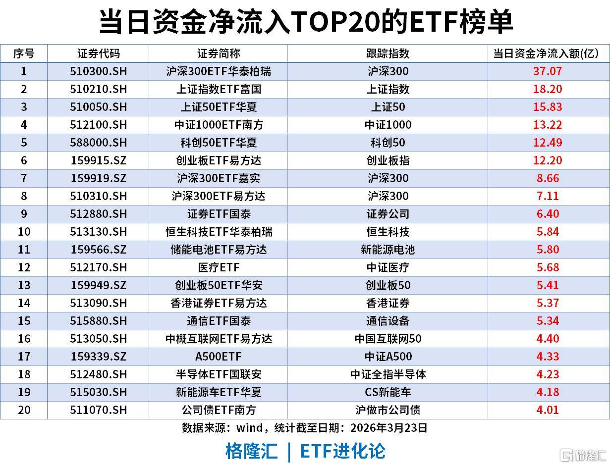 宽基指数是当(dang)日资金的绝对核心流向,沪深300ETF华泰(tai)柏瑞以37.07亿净流入领跑,叠加同标的其(qi)他产品(pin),沪深300系列单日合计净流入超52亿;上证(zheng)指数、上证(zheng)50、中证(zheng)1000、科创50、创业(ye)板等全谱系宽基均(jun)获大额加仓(cang),合计流入规(gui)模(mo)超百亿。