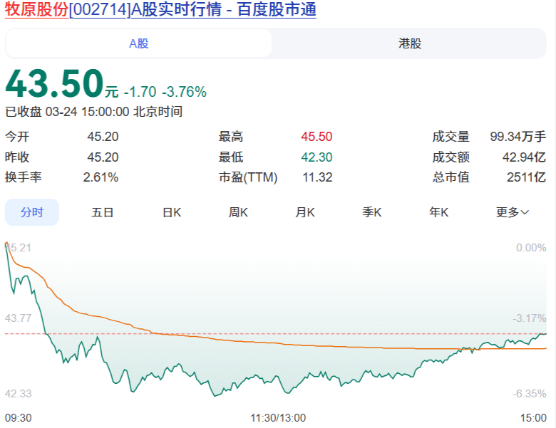 “猪(zhu)茅”牧原近日股价接连受挫。继3月23日大跌8.59%后,3月24日,牧原股份(002714.SZ)股价再度收跌3.76%。短短两日内,牧原股份股价便从(cong)49.45元(yuan)/股跌至43.5元(yuan)/股,最低时触及42.30元(yuan)/股。