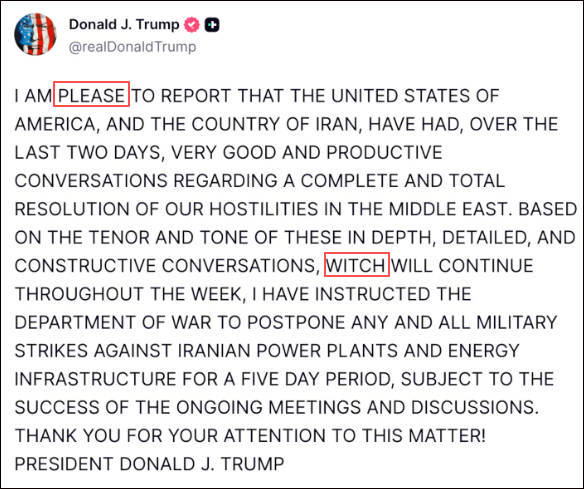 《每日野兽》指出,在这则简短的声明中,特朗普开头就出现了拼写错误,把“PLEASED”写成了“PLEASE”。文(wen)中,他还把“WHICH”写成了“WITCH”。