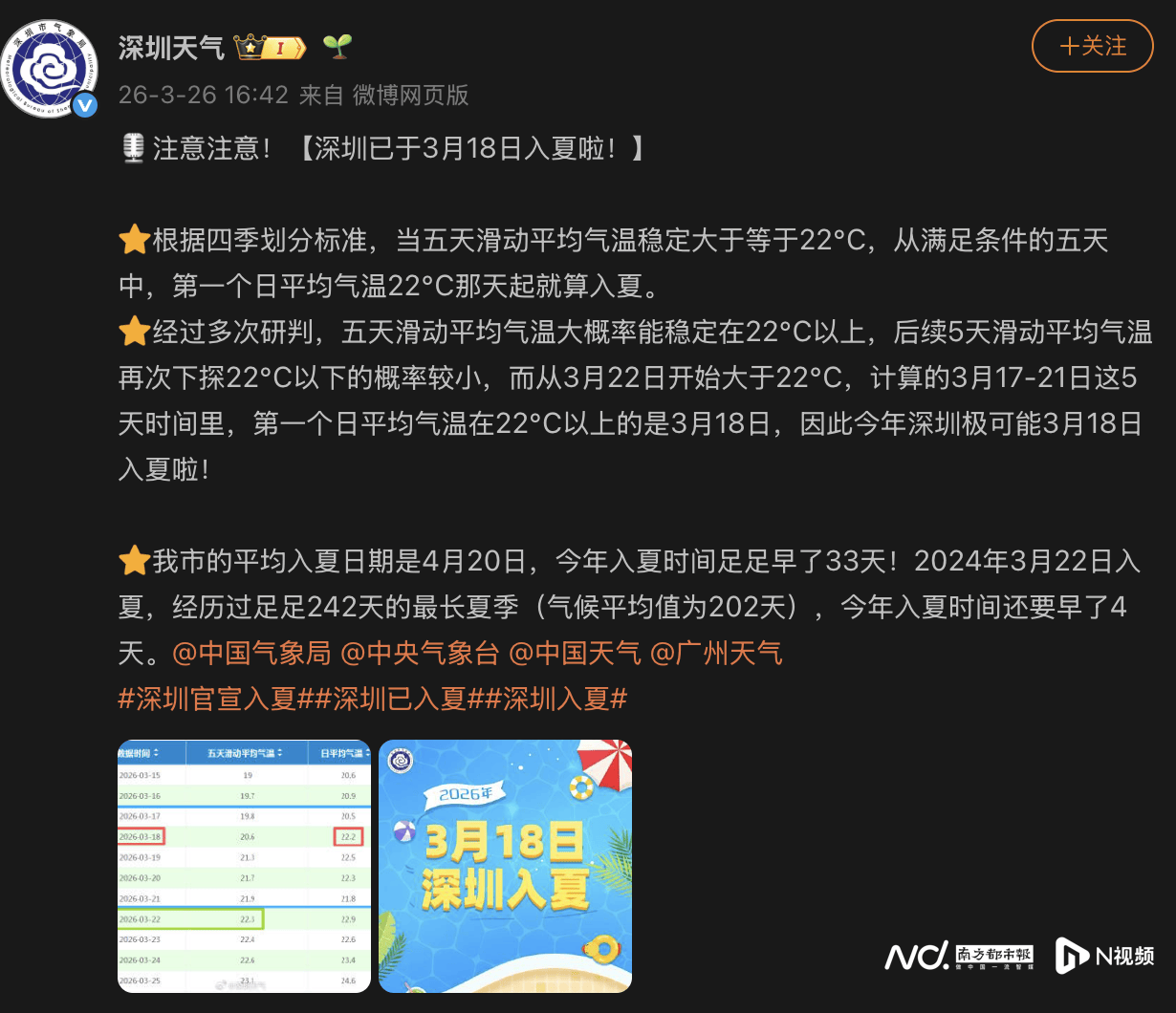 2026年3月26日下(xia)午,“深圳天色”官方微(wei)博“官宣”深圳3月18日已入夏。