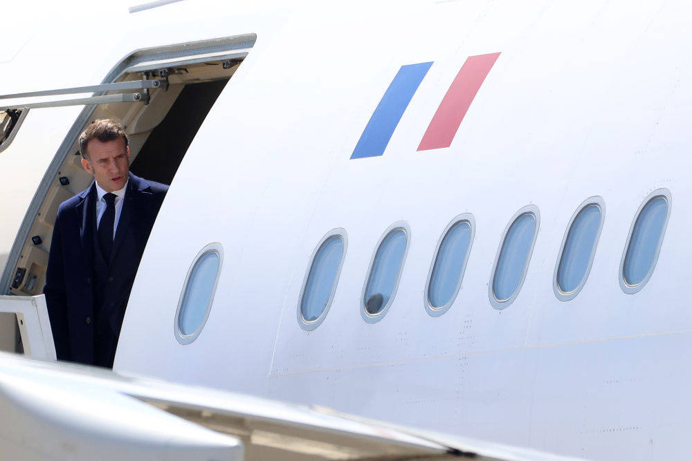 3月9日,法国总统马克龙抵达塞浦路斯西南部的帕潘德(de)里欧空军基(ji)地。新华社发(乔治(zhi)·克里斯托弗鲁摄)