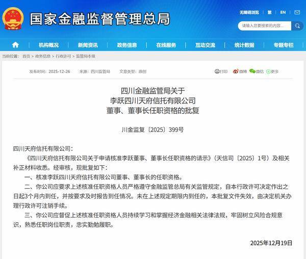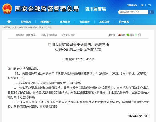 同时,四川(chuan)金融监管局核准杨豪(hao)天府信托总裁的(de)任职资(zi)格(ge)。以下是相关批复正(zheng)文(wen):