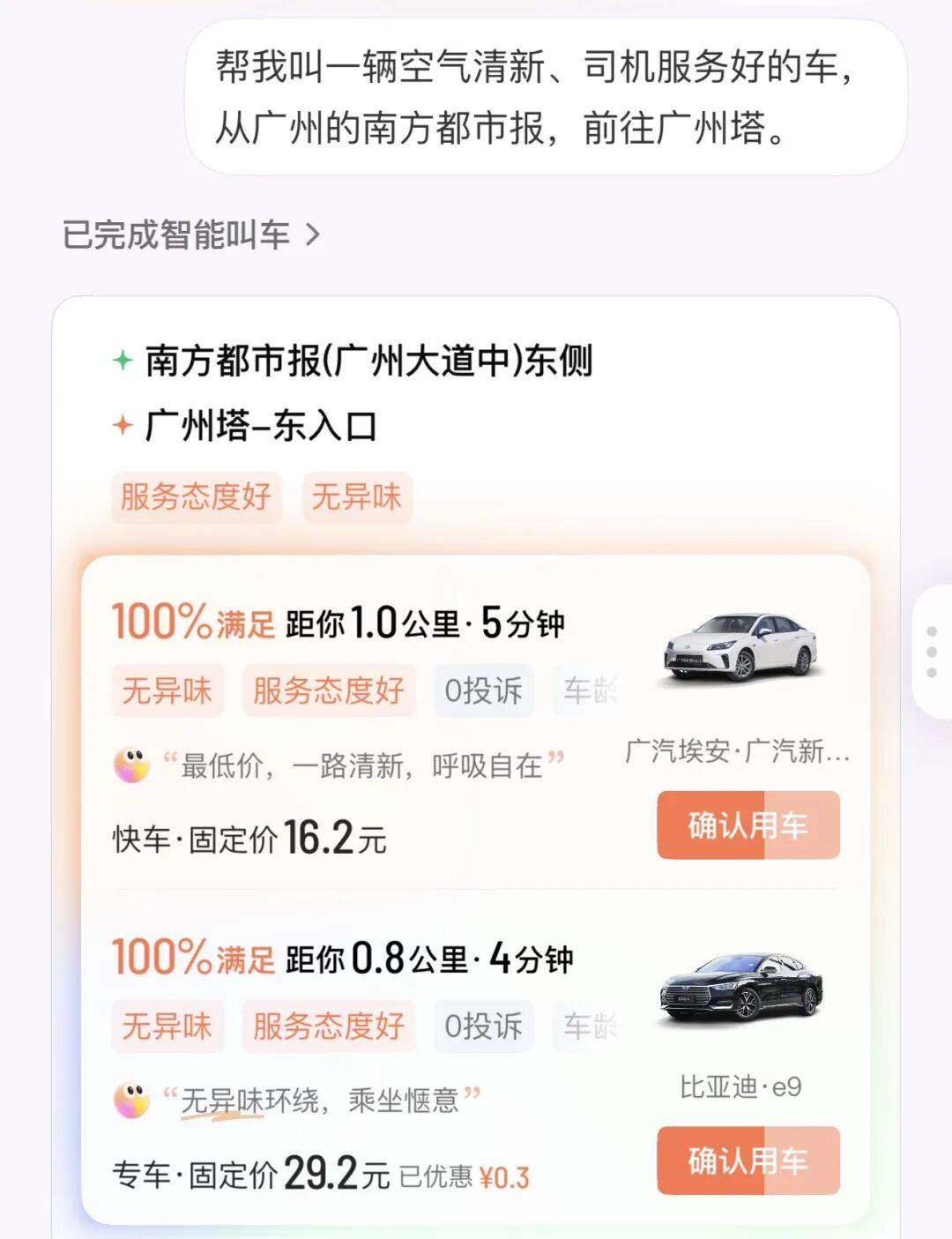 据滴滴公布的AI小滴运(yun)营数据:个性化叫车需求中,“又快又便宜”“空气清新”“最近的车”位列前三,分(fen)别为57%、12.5%、9.9%。其后是“不晕车”“车好”“后排(pai)宽敞(chang)”“新车”“坐感平(ping)稳”“服务好”“油车”等。目前小滴已支持90多个服务标签。可(ke)以看出,用户既在意效率和价格,也对舒适度有着个人偏好。尤其在接送家人、多人同行、商务出行等重要场景(jing)中,一辆精准匹配的车辆也会承载更多情绪价值。
