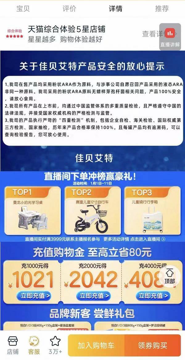 中国(guo)网财经1月9日讯 1月9日,针(zhen)对备受存眷的雀巢多国(guo)召(zhao)回婴幼儿配方奶粉,可(ke)能受到涉(she)事ARA质料商波及的环境,佳(jia)贝艾特正在其电商平(ping)台天猫官方商号提示:公司正在售产品均(jun)采纳粉状ARA作为质料,无蜡样芽孢杆菌相干问题,与涉(she)事企业志愿召(zhao)回产品采纳的液态ARA非同一(yi)种。公司产品上(shang)市前均(jun)通过中国(guo)监管体系、国(guo)际权威第(di)三方检测(ce)、企业自(zi)检等多重质量(liang)检验,请放心食用(yong)。