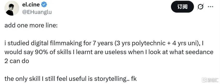 AI影视创意内容领域最为(wei)活跃的创作者之一“el.cine”发文感慨:“学了7年数字电影制作,现在感觉90%都白学了。”