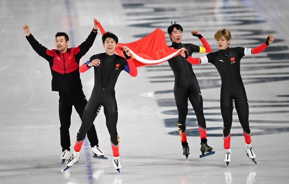 2月17日(ri),我国队选手(shou)宁忠岩(yan)、李文淏(hao)、吴宇、刘瀚(han)彬(bin)(从左(zuo)至右)正在赛后庆祝。新华社记者 武巍 摄