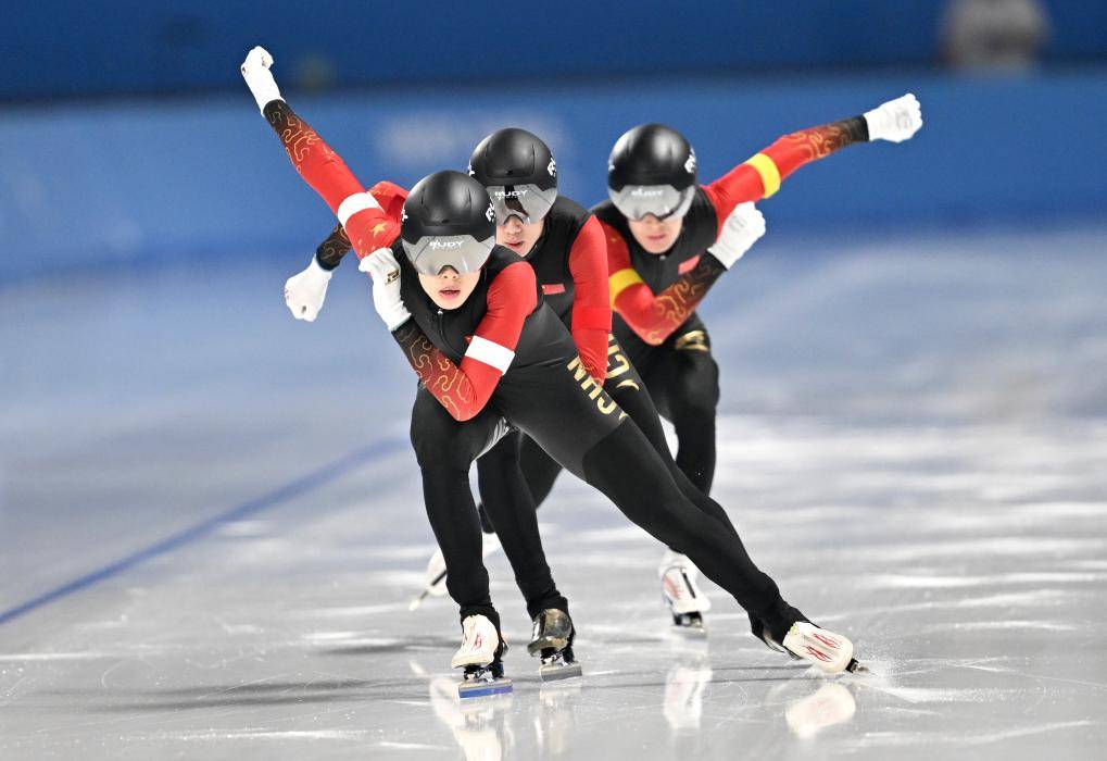 我国队选手(shou)刘瀚(han)彬(bin)、吴宇、哈(ha)那哈(ha)提·木哈(ha)买(mai)提(早年到后)正在亚冬会速度滑冰男(nan)子(zi)团(tuan)体追(zhui)逐决赛中(zhong)(2025年2月11日(ri)摄)。新华社记者 陈振海 摄