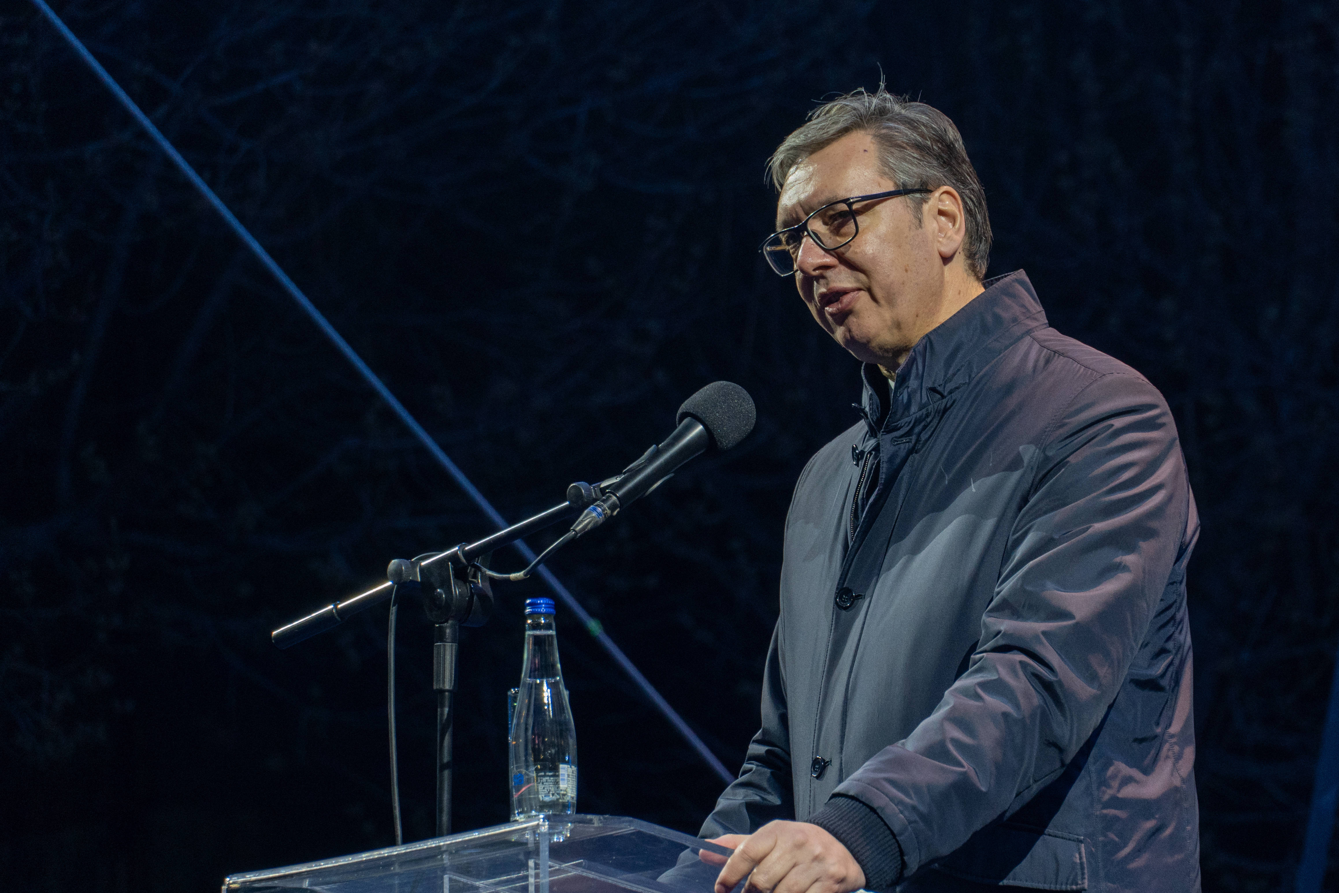 3月24日,塞尔维亚总(zong)统武契(qi)奇(qi)在弗拉涅举行的集会上发表讲话。 新华(hua)社发(内马尼亚摄)