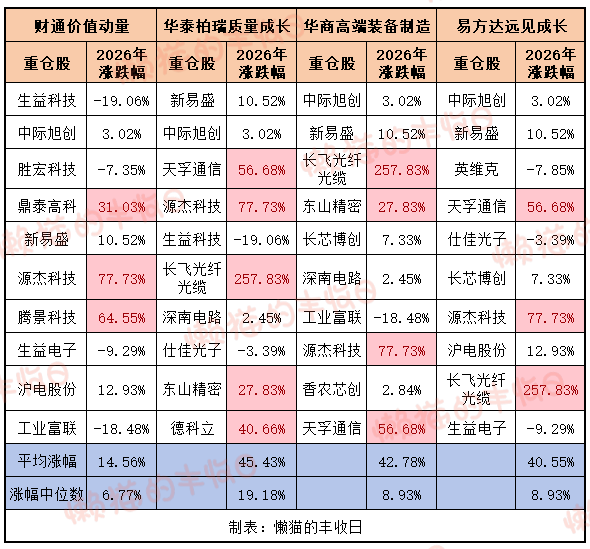 收益率(lu)更高的华泰柏瑞质量成长、华商高端装备制造、易方达远见成长,重(zhong)仓了更多大涨的股票,十大重(zhong)仓股平均涨幅和涨幅中位数也更高。