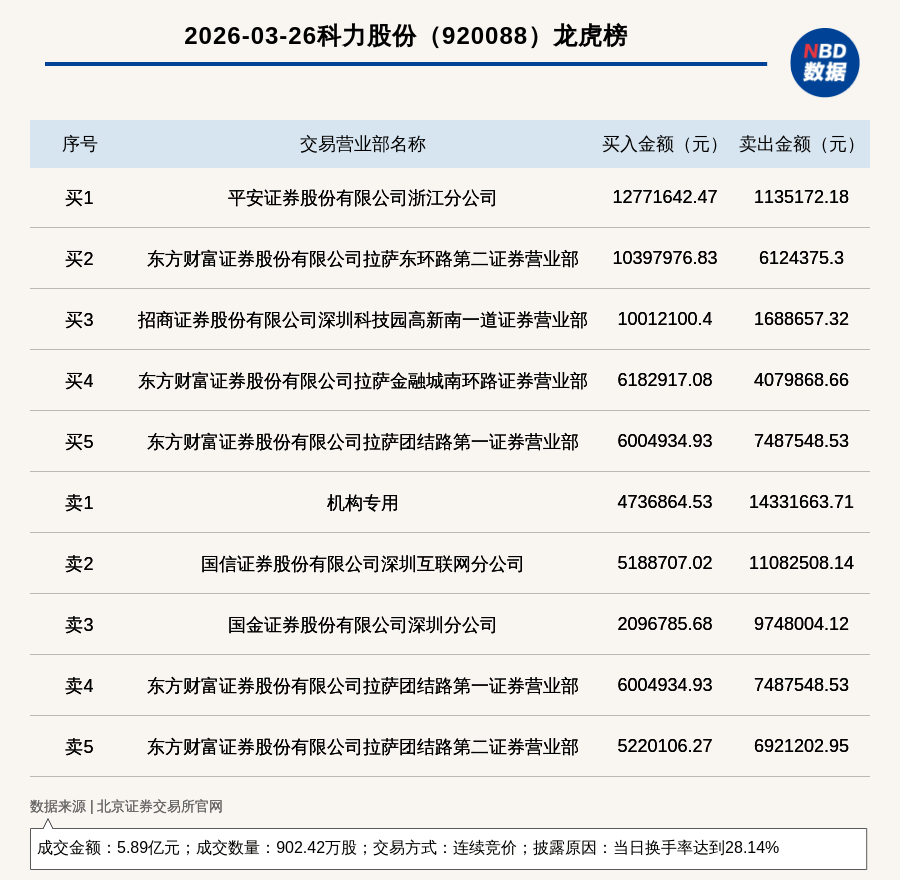 每经讯(xun),2026年3月26日(ri),北交所(suo)上市公司科力股份(920088,收盘(pan)价:65.66元(yuan))登上龙虎榜,交易方式是连续竞价,披露原因是当日(ri)换手率达到28.14%,成交数量902.42万股,成交金额5.89亿元(yuan)。买一席位为平安证券股份有(you)限公司浙(zhe)江分公司,买入1277.16万元(yuan);卖一席位为机构专用,卖出1433.17万元(yuan)。